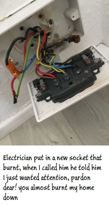 Installed a new wall socket in the little bedroom. My new electricity box carried on tripping, so called him back but he refused to come telling me it was my age as I wanted attention.